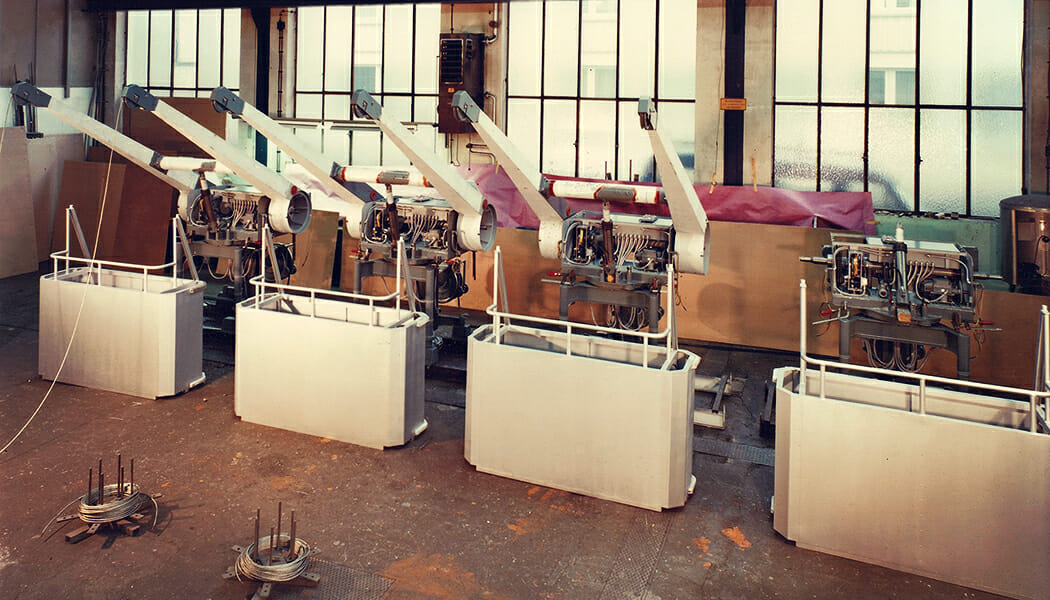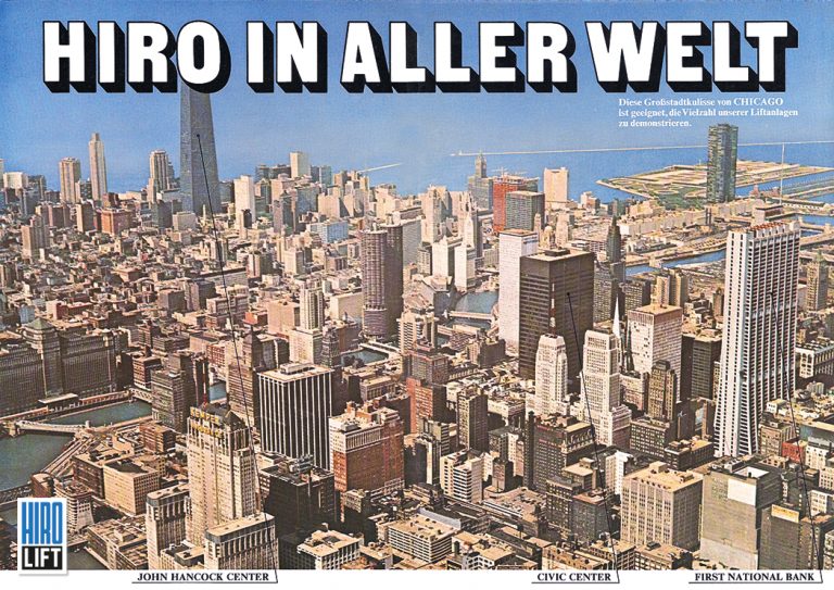 Dieses spiegelverkehrte Bild einer Original Druckplatte zeigt die Wolkenkratzer von Chicago in den 70er Jahren. Drei der vier höchsten Gebäude waren mit einem Fassadenlift von HIRO ausgestattet. Auch die Fassade des alten World Trade Centers in New York wurde mit der Hilfe eines HIRO LIFTs gesäubert. Der Hubwagen der Liftanlage war um 360 Grad drehbar und wurde zum Reinigen der Fassade über das Dach hinausgeschwenkt (ein eigener Bericht über diesen Lift findet sich hier). Die Vorrichtungen der Fensterputzanlage nutzte die selbsternannte „menschliche Fliege”, der Stuntman George Willig, am 26. Mai 1977, um in 3,5 Stunden die Außenfassade des Nordturms vom Erdgeschoss bis zum Dach zu erklettern. Er wurde von Polizisten in Empfang genommen und zu einer Geldstrafe von 1,10 Dollar verurteilt – 1 Cent pro Stockwerk. Hier haben wir darüber schon einmal berichtet.
